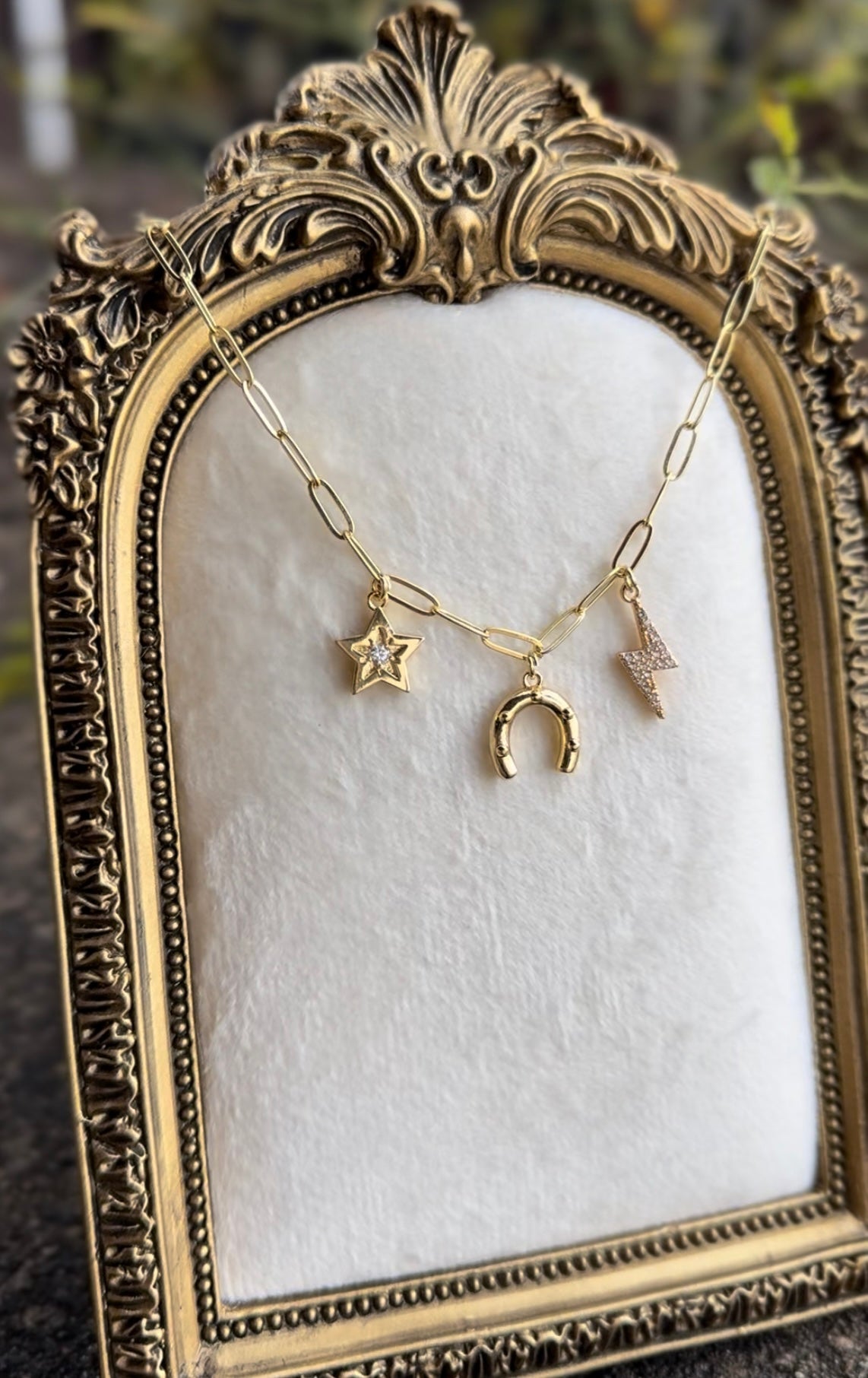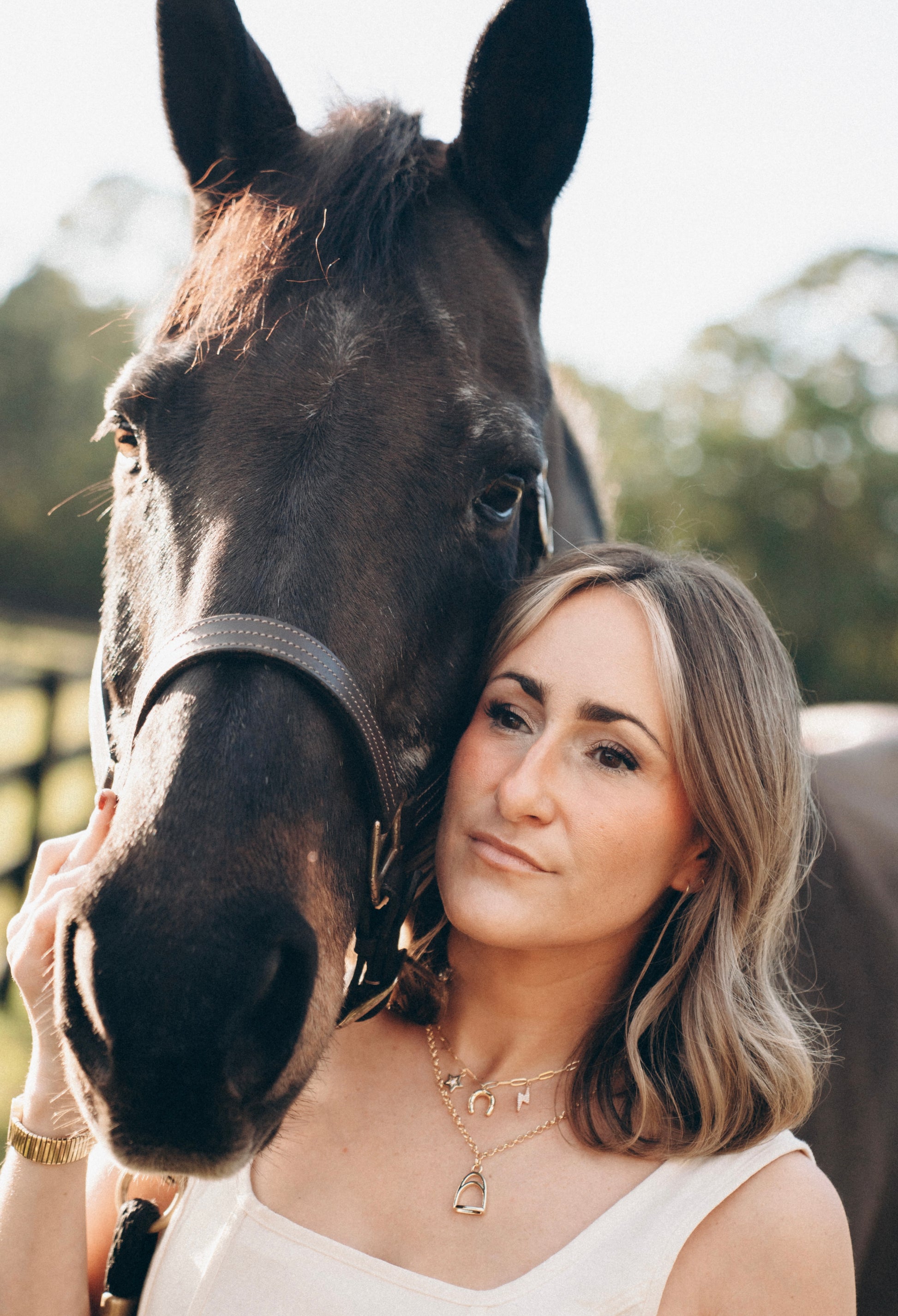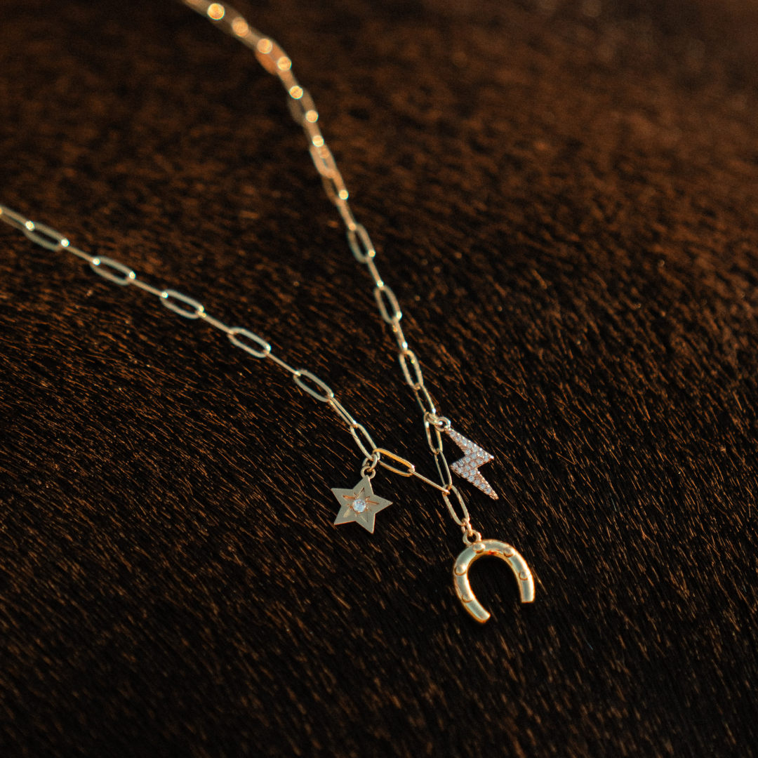 This piece reflects that spirit of momentum. Crafted on a sleek paperclip chain, each charm is placed with intention to capture the feeling of a perfect round: quick decisions, electric focus, and the magic of a horse who meets you stride for stride.